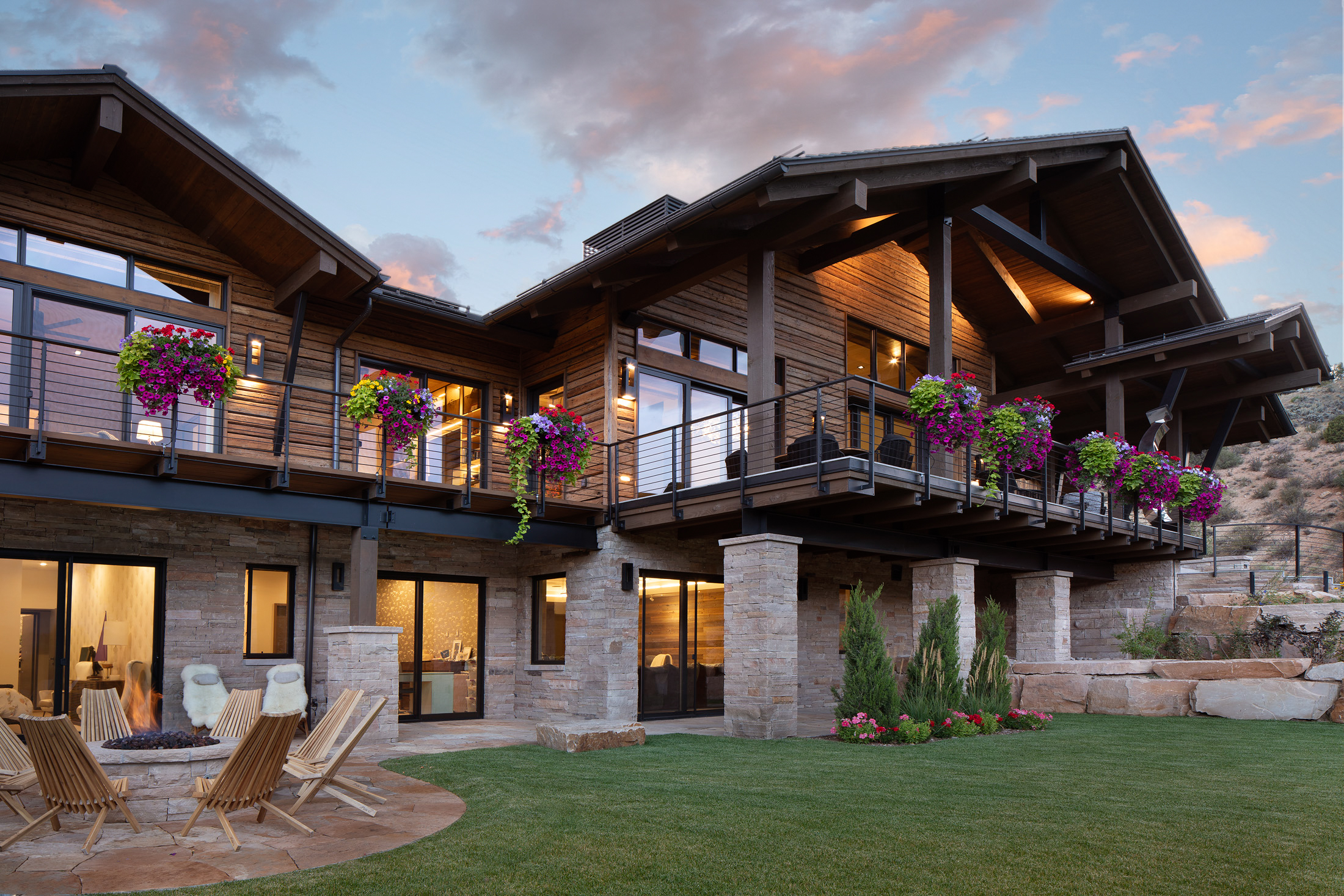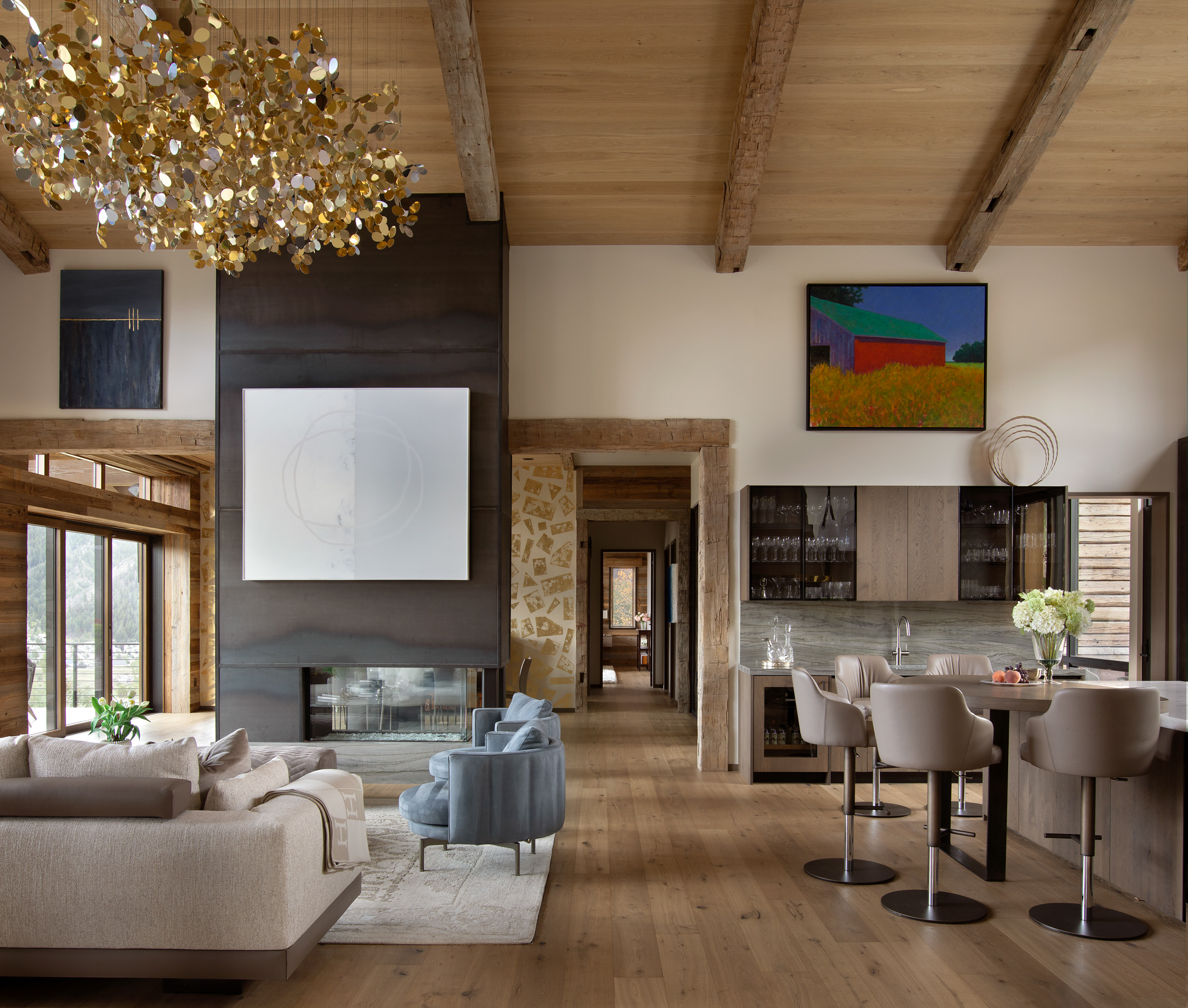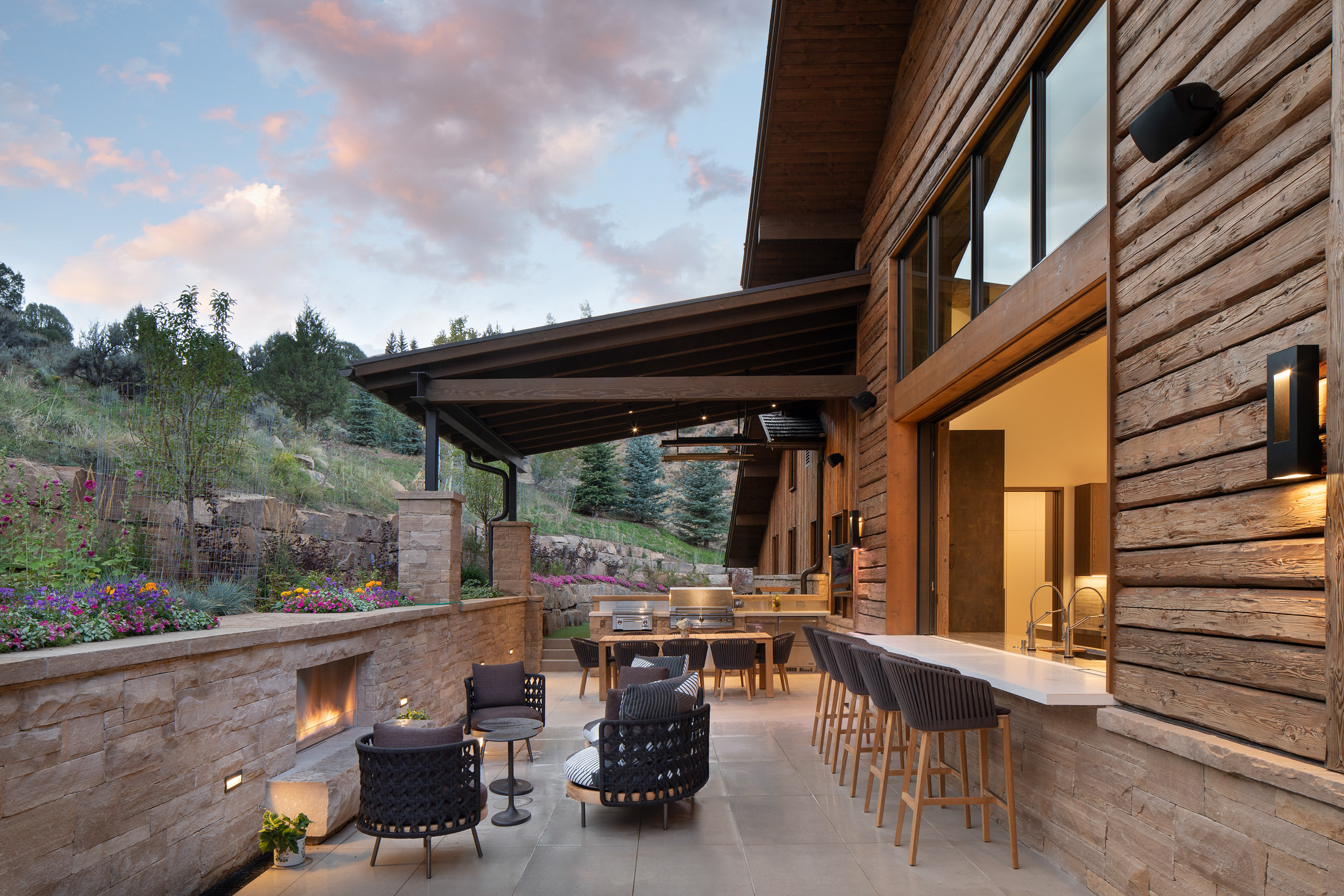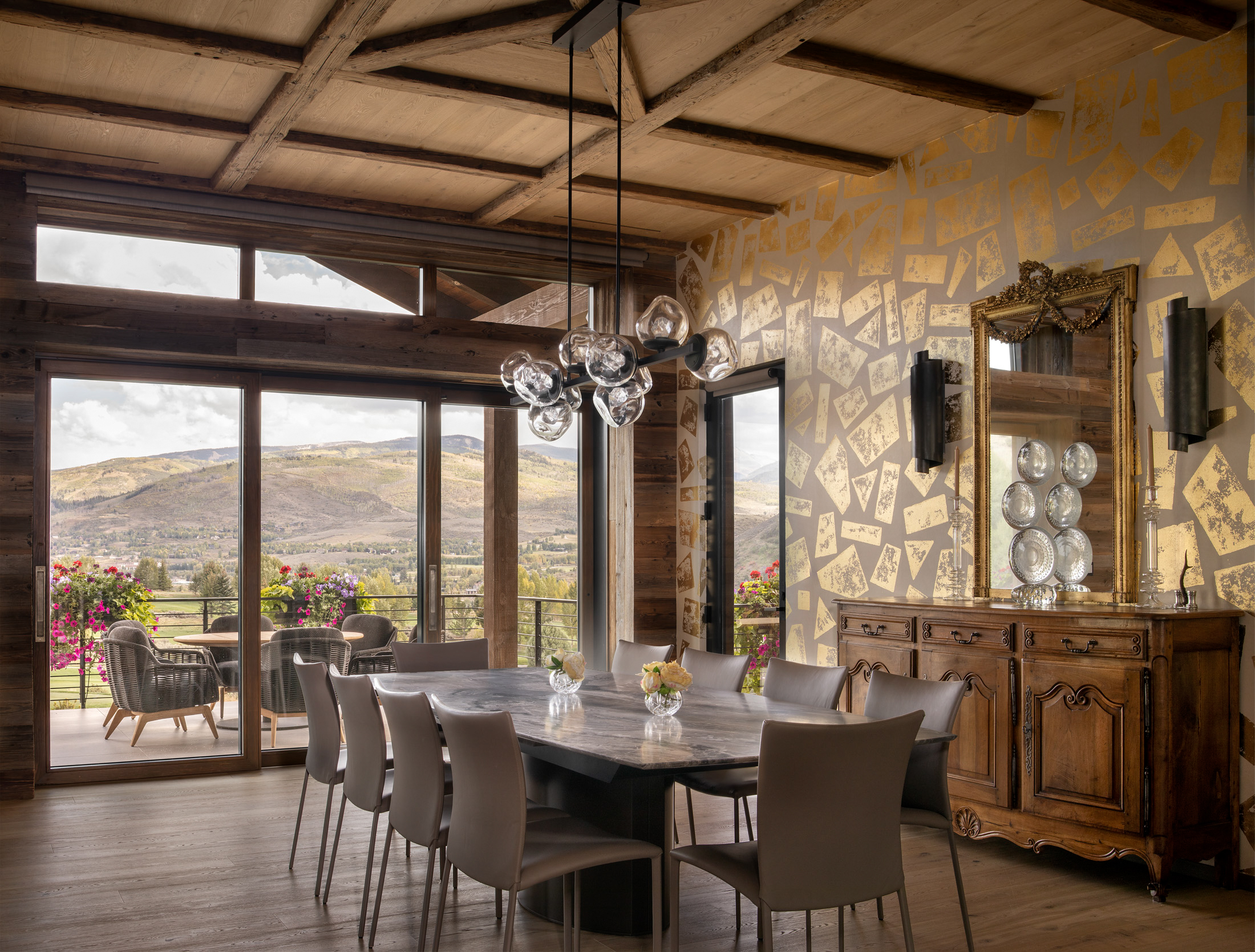 Nestled on a south-facing slope in the valley of Vail, CO, this unique residence includes sweeping views of the New York mountain range with a glimpse of nearby ski resorts. Inspired by the heritage of France and mountain chalets found high in the French Alps, the home presents vernacular characteristics of sweeping slope roofs, large overhangs, and expansive timber structures. Hints of modernity are reflected throughout the project’s details, with structural support elements coupled with rustic wood siding and integrated stone cladding. The residence exudes the nature of modern elegance, and speaks to the beauty of mountain architecture. Élégance montagnarde rustique et moderne!